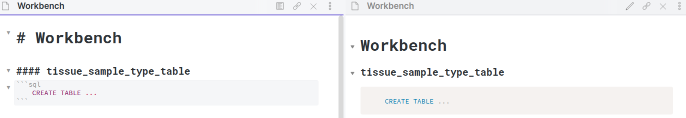 What I want is to have the table name then a spin down that is the code block for the create command for that table.