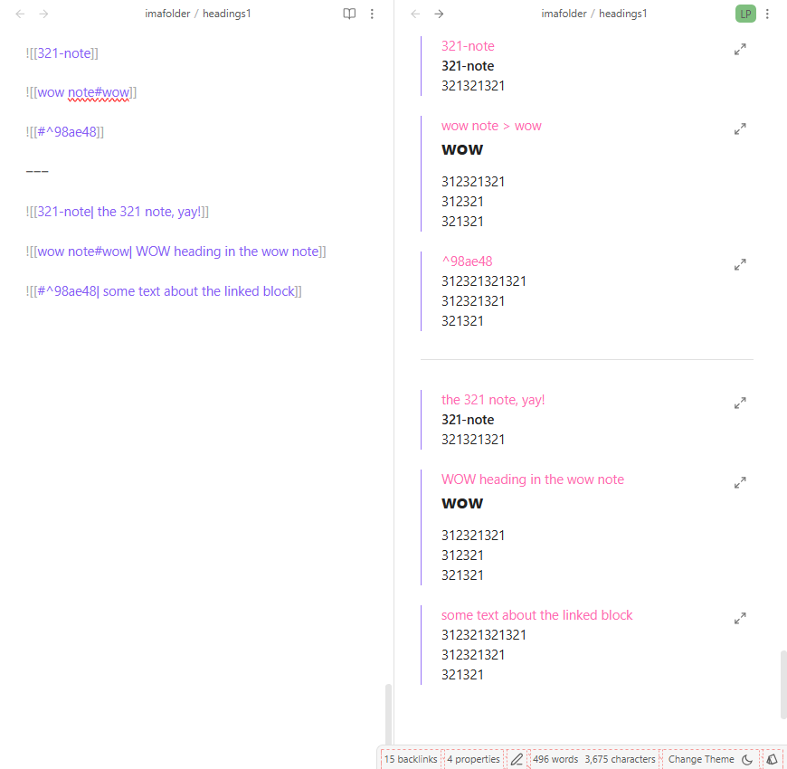 Yeah, I don’t know a way to stop them from being hidden, but we can kind of fake it with some CSS. If you don’t add any alt/attribute text, the link content will show as is, but you can add your own text using attribute text. e.g. ![[321-note| the 321 note, yay!]]