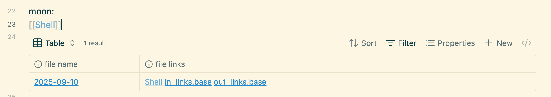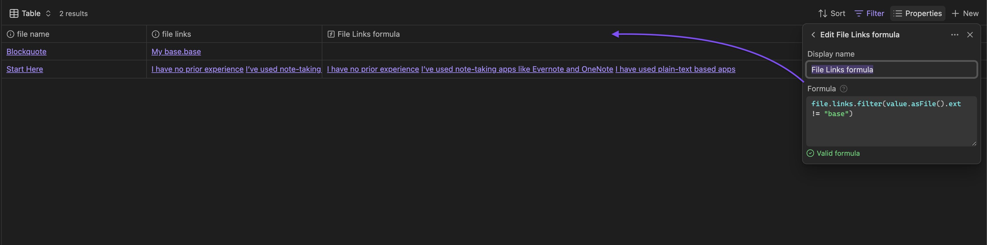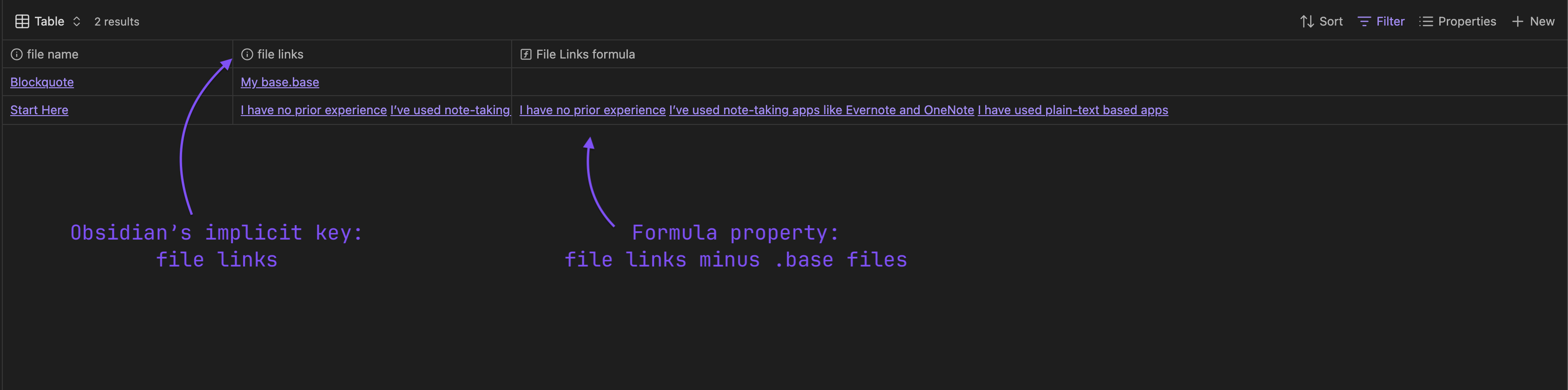 The last field/column, on the other hand, is a formula property in which the .base files have been filtered out from file.links with this formula: