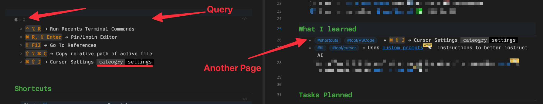 - Filters only items tagged #shortcuts and #tool/