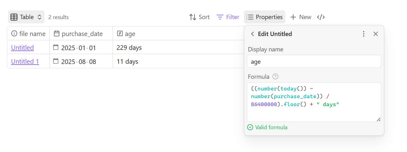 I have a database that lists various events, with formulas that generate columns showing how old I was when the event happened, and how long ago the event was from today. Notion has a really convenient dateBetween() function, and it would be pretty cool to see something like that in Obsidian.