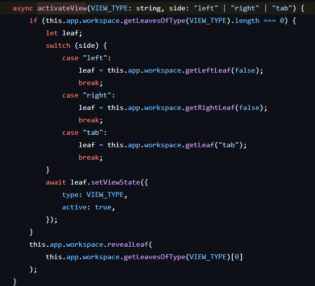 I noticed your code uses this.activateView(VIEW_TYPE_EXAMPLE, "left");
