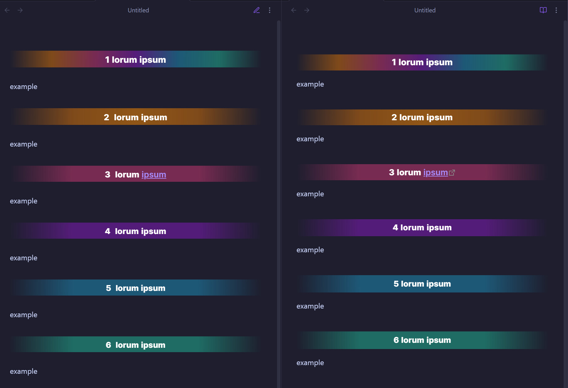 Hi, how are you? I’d like your help optimizing this Obsidian snippet. I was searching and optimizing, and I finally figured out how to make the titles centered and rainbow-colored. However, in view mode, the note looks fine, but in edit mode, it looks horrible, and the titles are too big.