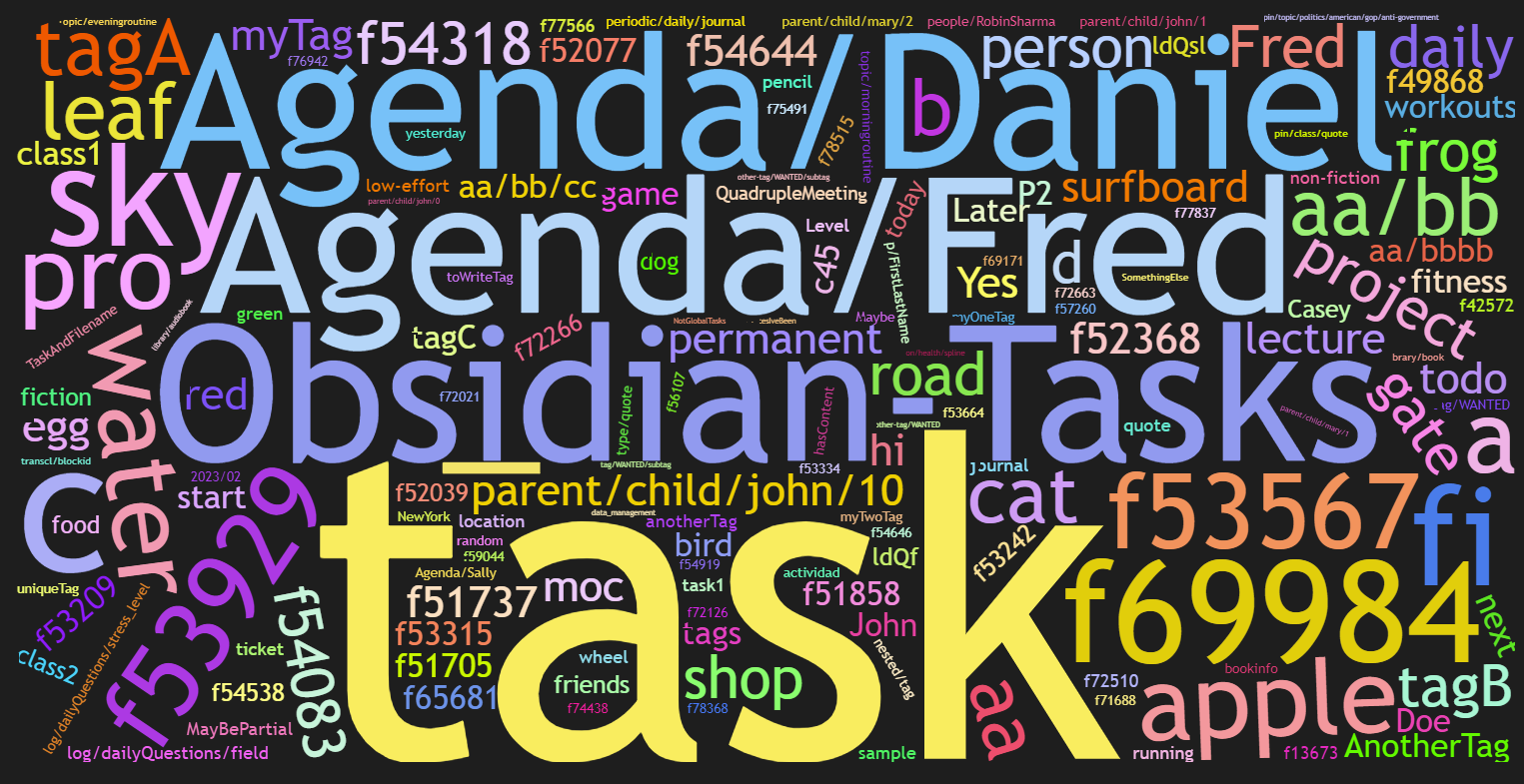 Note that if you make the boxes too large, you enter into a race condition with how much of the current note Obsidian keeps loaded, and this can make Obsidian seem to hang. With the settings above, and my 834 tags, this displays on a 24" (2560x1440) initially as: