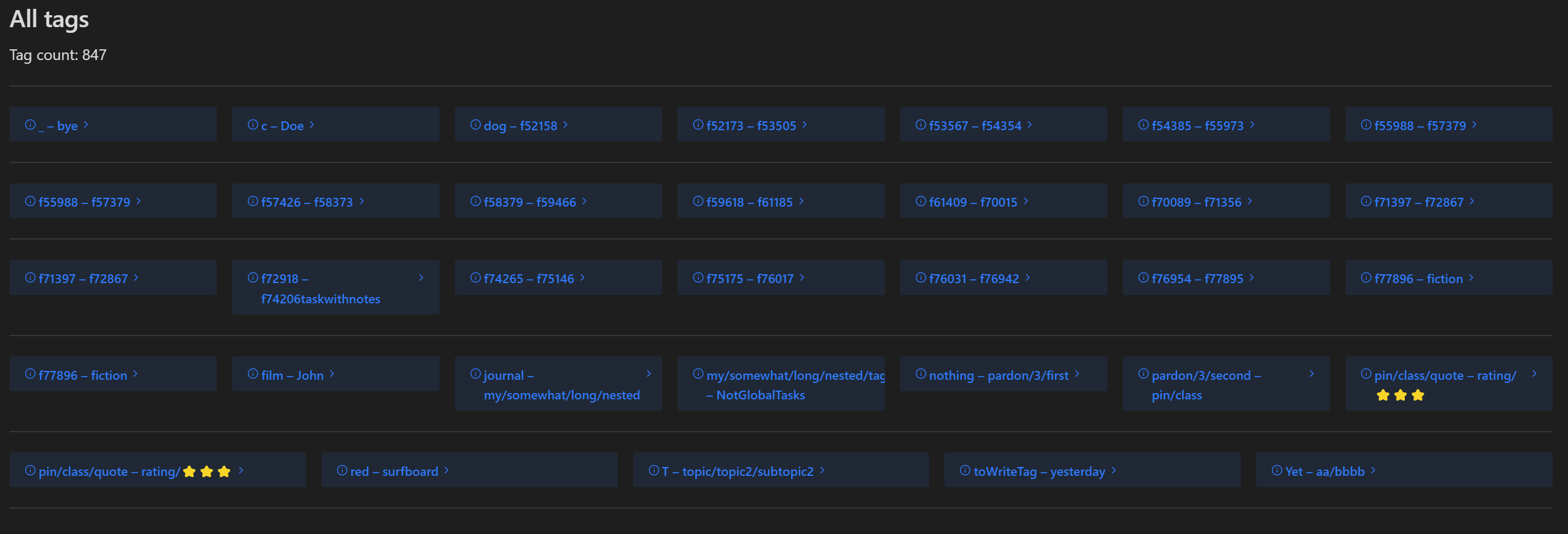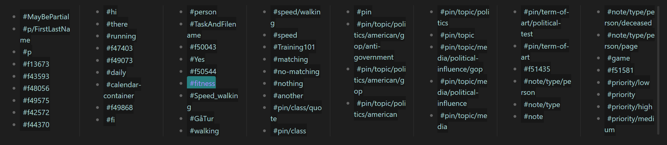 My test vault has 849 tags, so when I used this code like this with all 849 tags it stalled my laptop. I reckon it’s too heavy to do that kind of lifting using only CSS, as the multi column css class splits into multi columns. The output of the above query was for me: