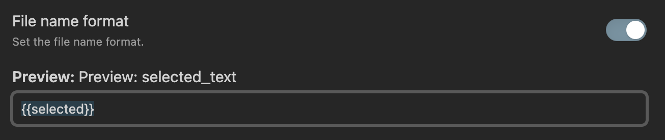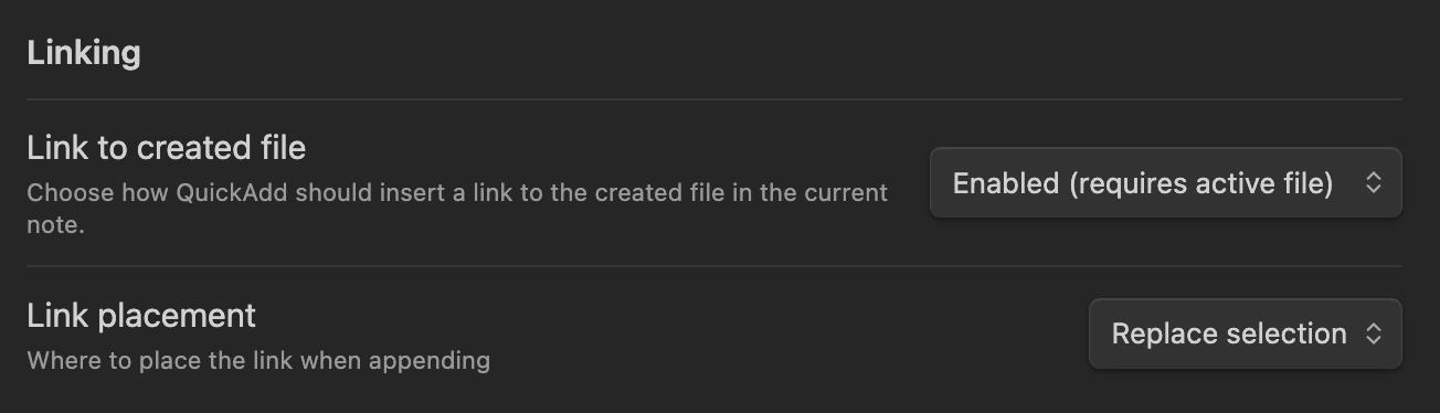 I’ve got a QuickAdd template with {{selected}} as the file format. I select a bit of text in my active editor and run the QuickAdd template. The note is getting names like 1.md, 2.md and so on, the selected text is ignored. I also don’t get the link in my original file.