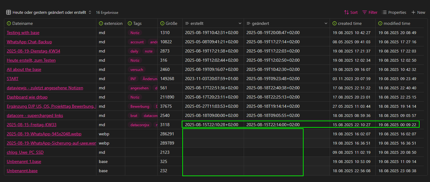 I have a base query for notes that are created or edited today or yesterday. I sync between different file systems (Android, Linux, Windows, …) and so I trust the creation (erstellt) and modified (geändert) in YAML more than the date of the file systems.