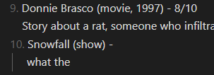 When you make a list where every item has 2 lines split by SHIFT + ENTER, anything after the 10th item will get the quote (I think?) formatting, the little line on the left, with no way to remove it while keeping the text in line