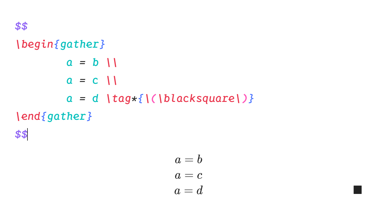 $$\tag*{(\blacksquare)}$$ in multi-line math, and it looks like this