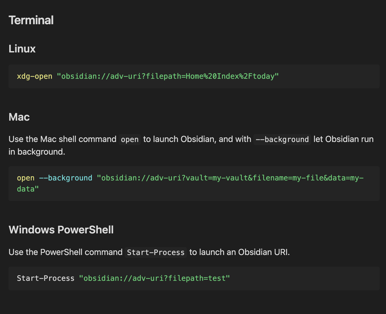 The last part of executing Templater using command line is still missing though. You could instruct Templater using Advanced URI but this requires simulating the file opening and then closing it. There is openmode=silent but I’m not sure does it work (https://publish.obsidian.md/advanced-uri-doc/Concepts/Navigation+Parameters).