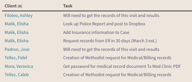 TABLE WITHOUT ID file.link AS Client, t.text As "Task" FROM "Active Docket" FLATTEN file.tasks AS t SORT Client ASC ``` Given the image, I want to group by the client. when I try to add a Group by I get nothin in the results? HELP!
