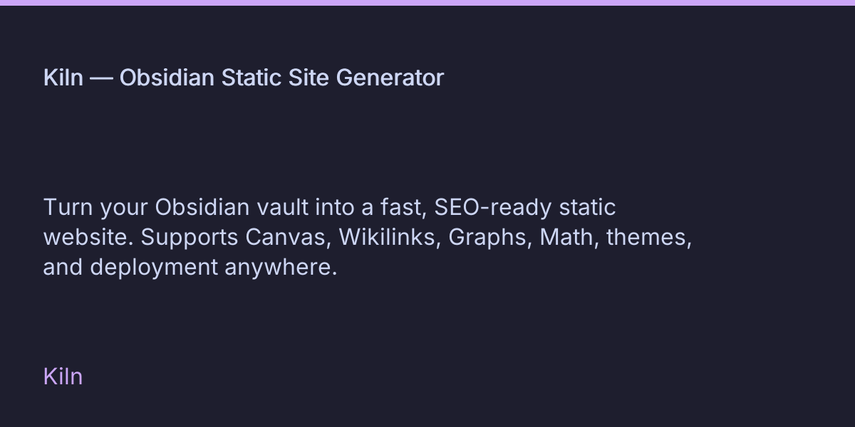 I’ve been working on Kiln, an open-source static site generator built specifically for Obsidian. The idea behind it is simple: if it works in Obsidian, it should work on your website — no rewrites, no workarounds.