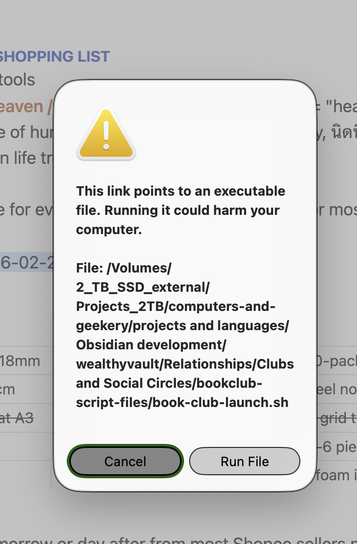 Obsidian 1.12 brings a great security feature that warns users when an executable file is about to be run. This is very helpful for navigating vaults that are not familiar, but presents additional friction in cases where the executable files are fully trusted (such as ones you authored yourself). The ability to add executable links to Obsidian is a great feature for building dashboards, and having a way to reduce clicks when content is trusted would be helpful to power users.