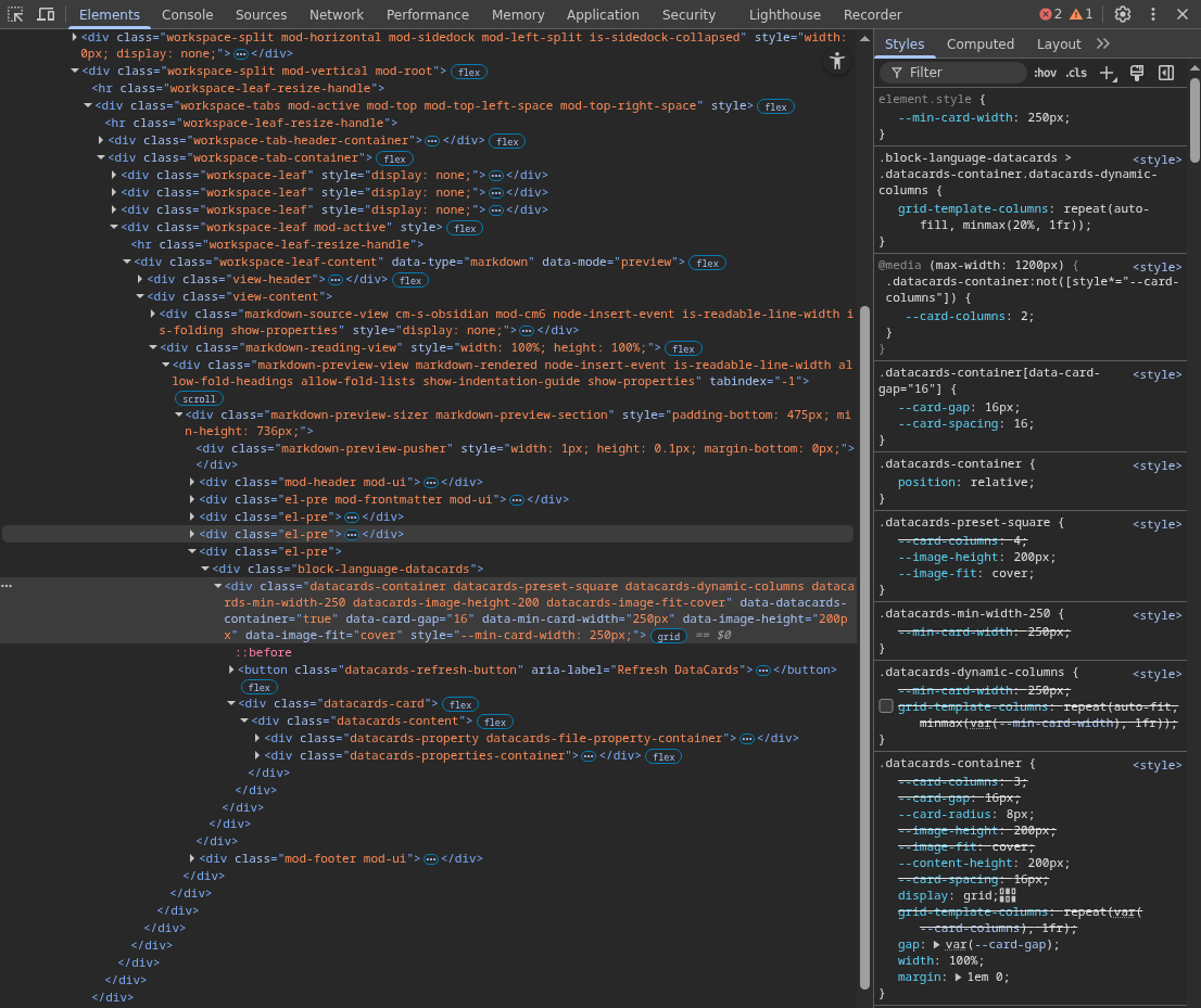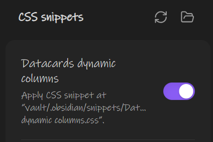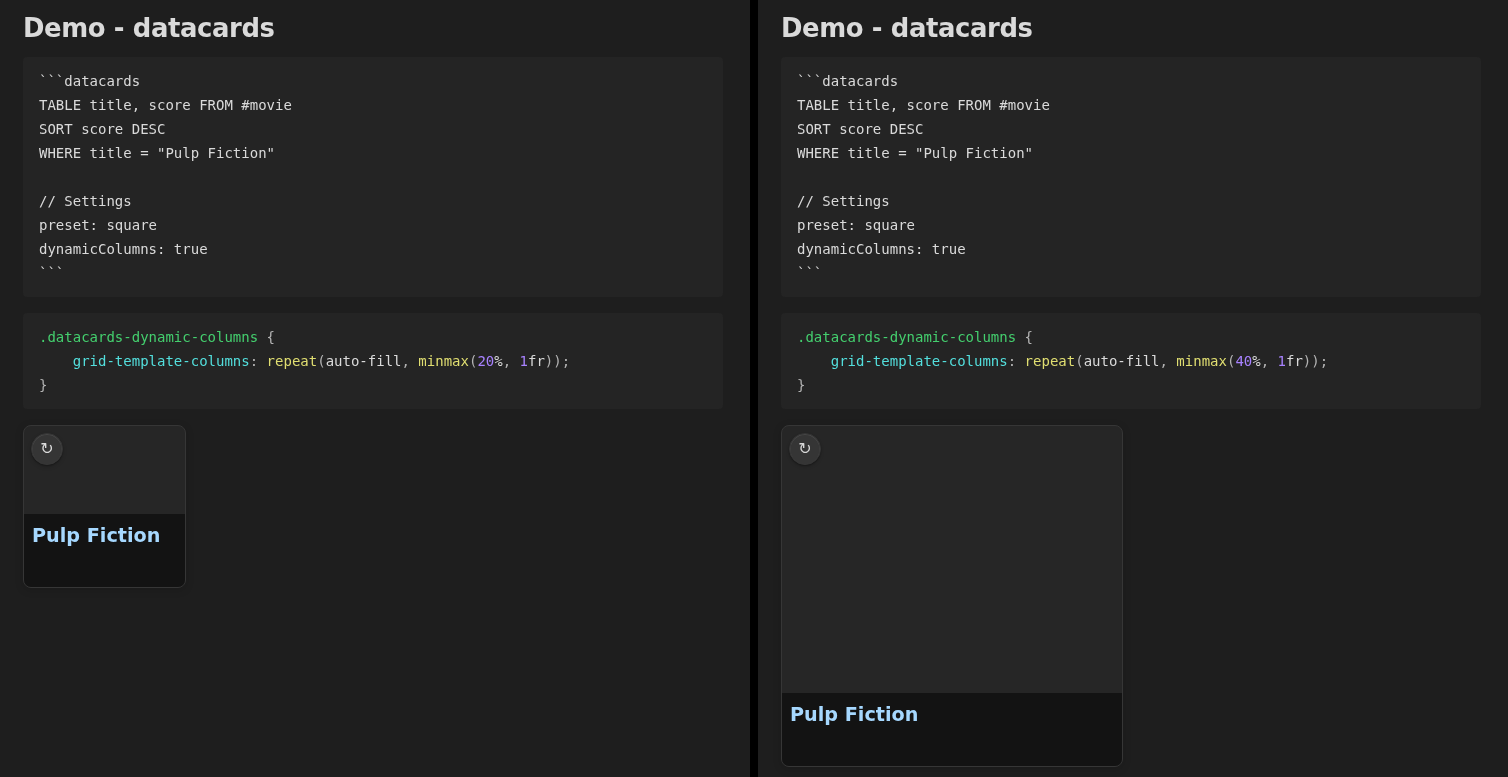 I have dynamic columns (for the datacards plugin) switched off because I don’t like the fact that the cards become so large when there is only one of them. I was wondering if I could have something similar to dynamic columns, though, but with a restricted width/size. I was thinking either of having dynamic columns turned on, with a maximum width/height (I tried coding the maximum in, but I don’t know how to do it, and it didn’t work), or (preferably) limiting the size of all datacard views to a percentage of the read width (which changes due to readable line length), which would be more useful, and (I assume) simpler.