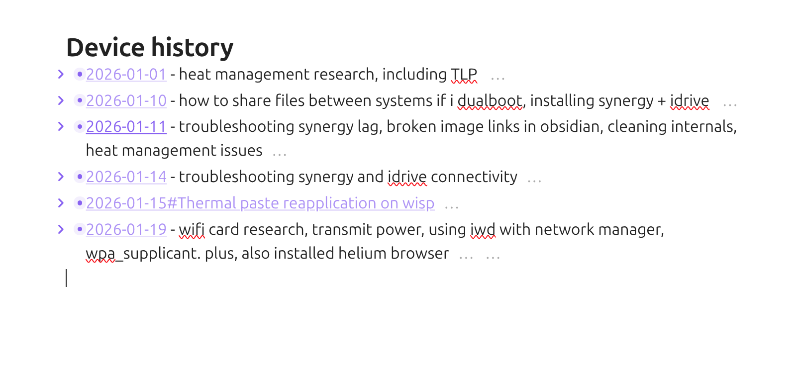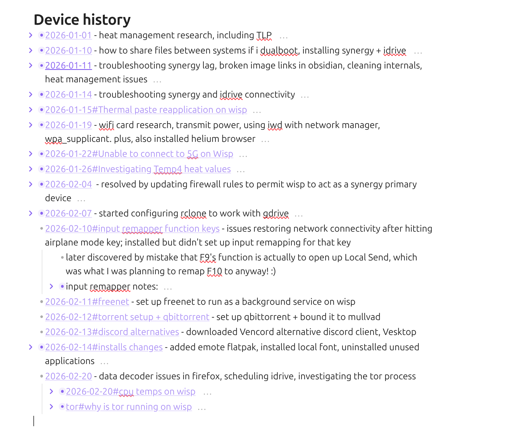- [[##2026-01-11#Backup Status update wisp maintenance|2026-01-11]] - troubleshooting synergy lag, broken image links in obsidian, cleaning internals, heat management issues