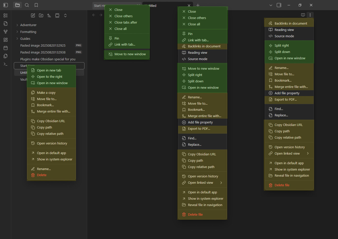 The tab menu contains many items that aren’t about tab management. Removing those gives us a much more manageable menu. (“Link with tab…” and “Open linked view” seem redundant but maybe they do different things?)