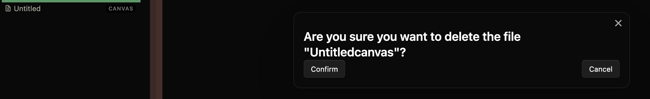 In the “are you sure” dialog, when deleting a canvas with the default “untitled” name, the name and extension are munged together: “untitledcanvas”. Not a dysfunction, just a cosmetic thing.