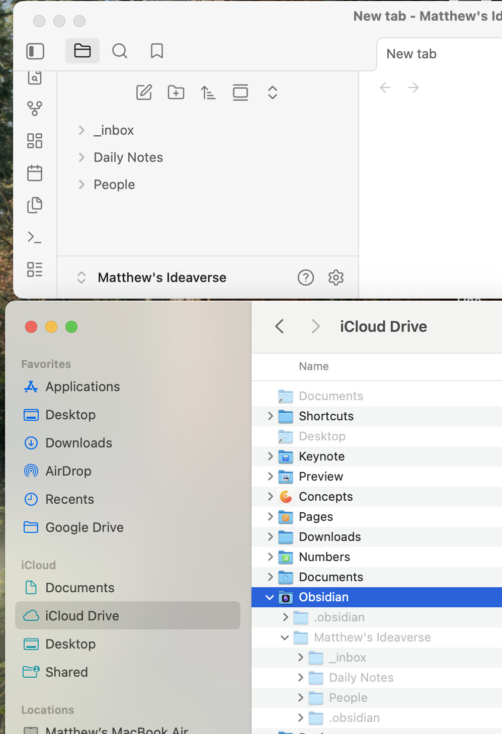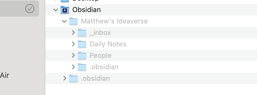 Your vault, Matthew’s Ideaverse, is in the correct location. Now we need to do step three above to get Obsidian on macOS reading and opening that folder as a vault.