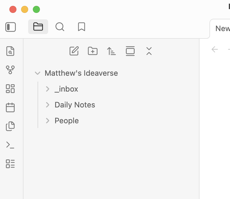 In the lower left of the left sidebar, click on “Obsidian” (in my second screen shot it’s “plain”) → Manage vaults... → Open folder as vault → have the Finder open Matthew’s Ideaverse. Obsidian will open a new vault with only your top level folders shown: inbox, Daily Notes, and People. Close the first vault.
