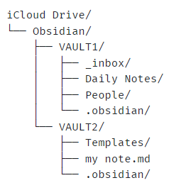 edit: grabbed an older image of mine from Finder and iOS. Here there are four vaults in the main Obsidian folder, each with their own files, folders, and .obsidian settings folder.
