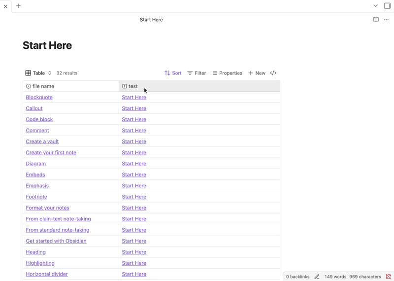 - In the Sandbox vault, create a .base and add a custom formula column.
