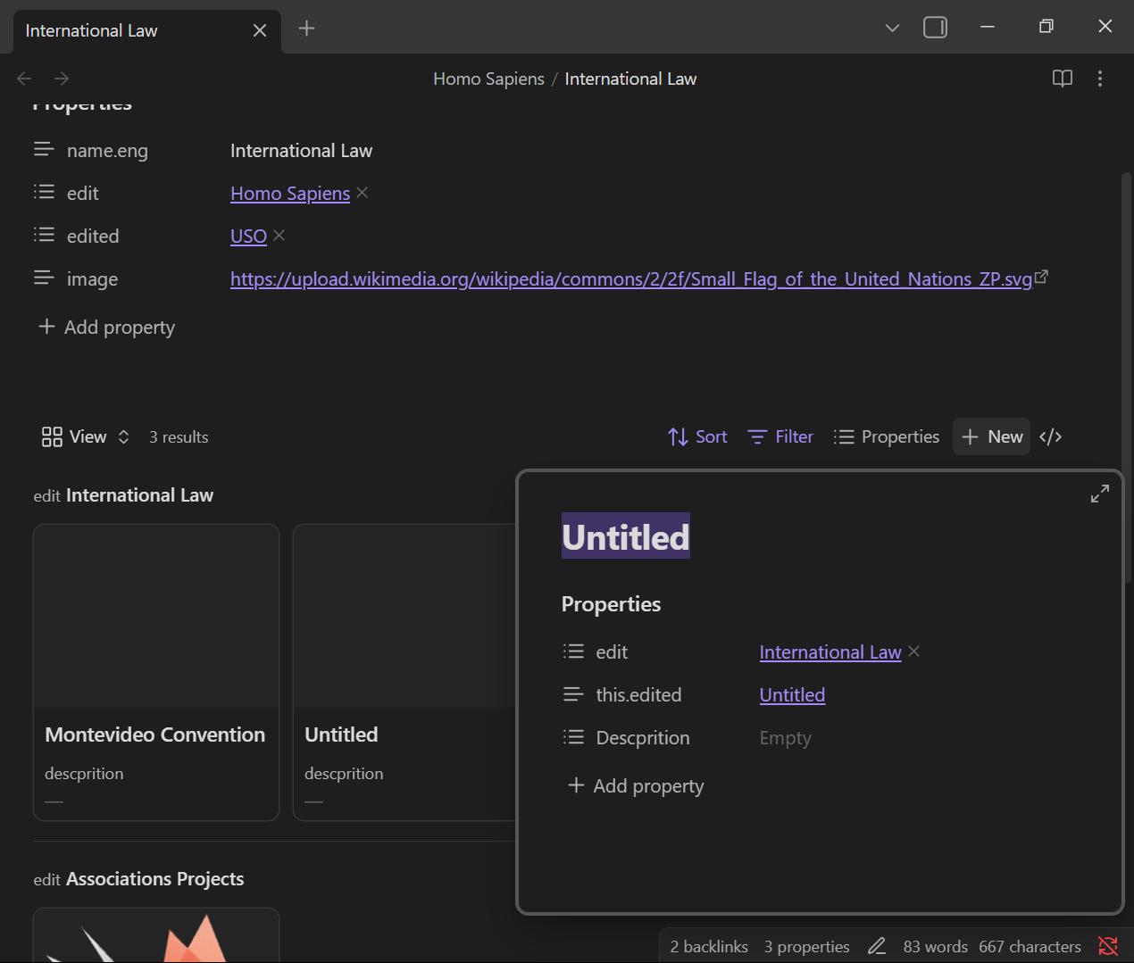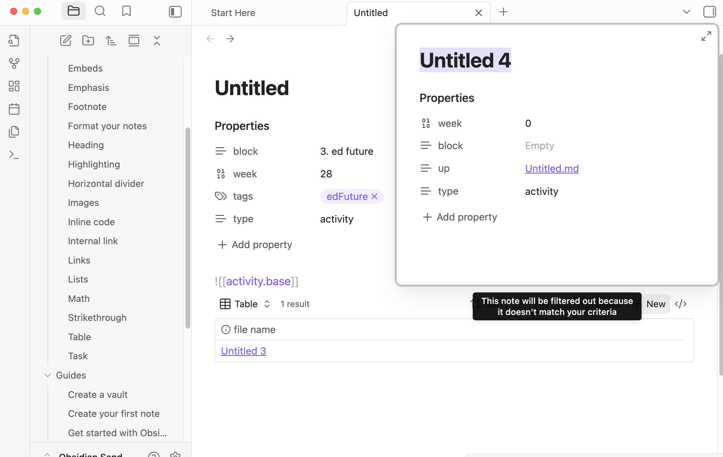 A new note in the embedded base with the filtered properties set