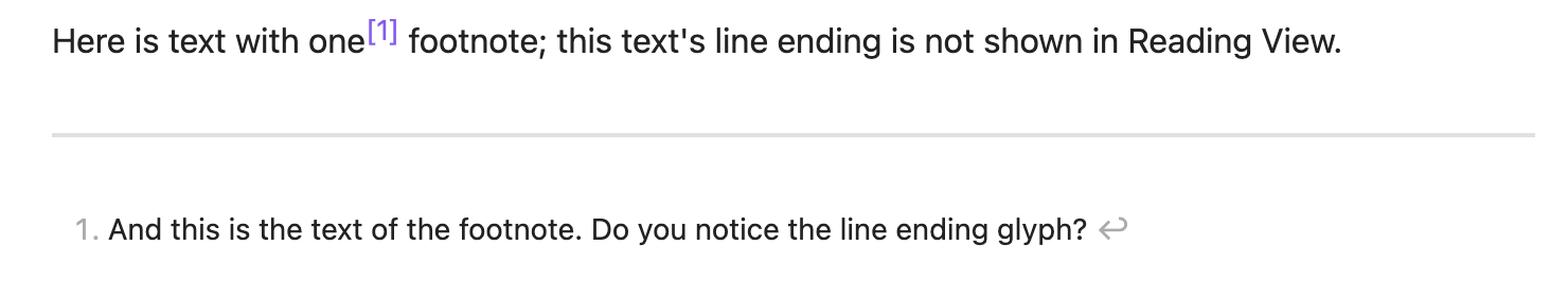 Here is text with one[^fn] footnote; this text's line ending is not shown in Reading View.