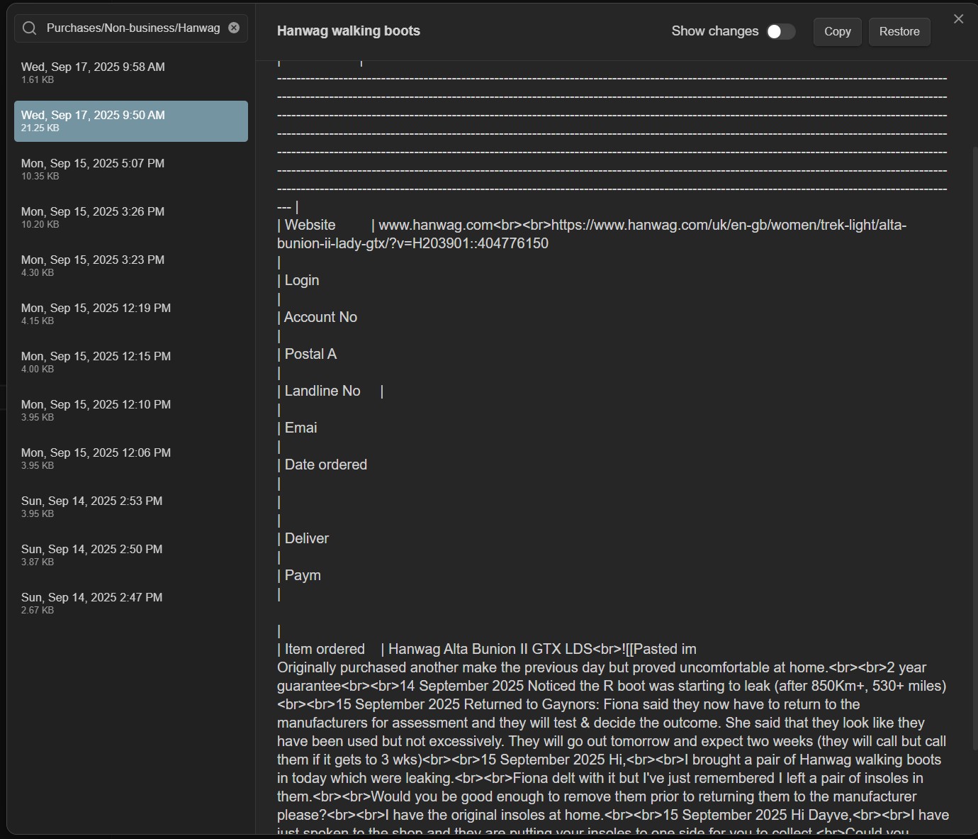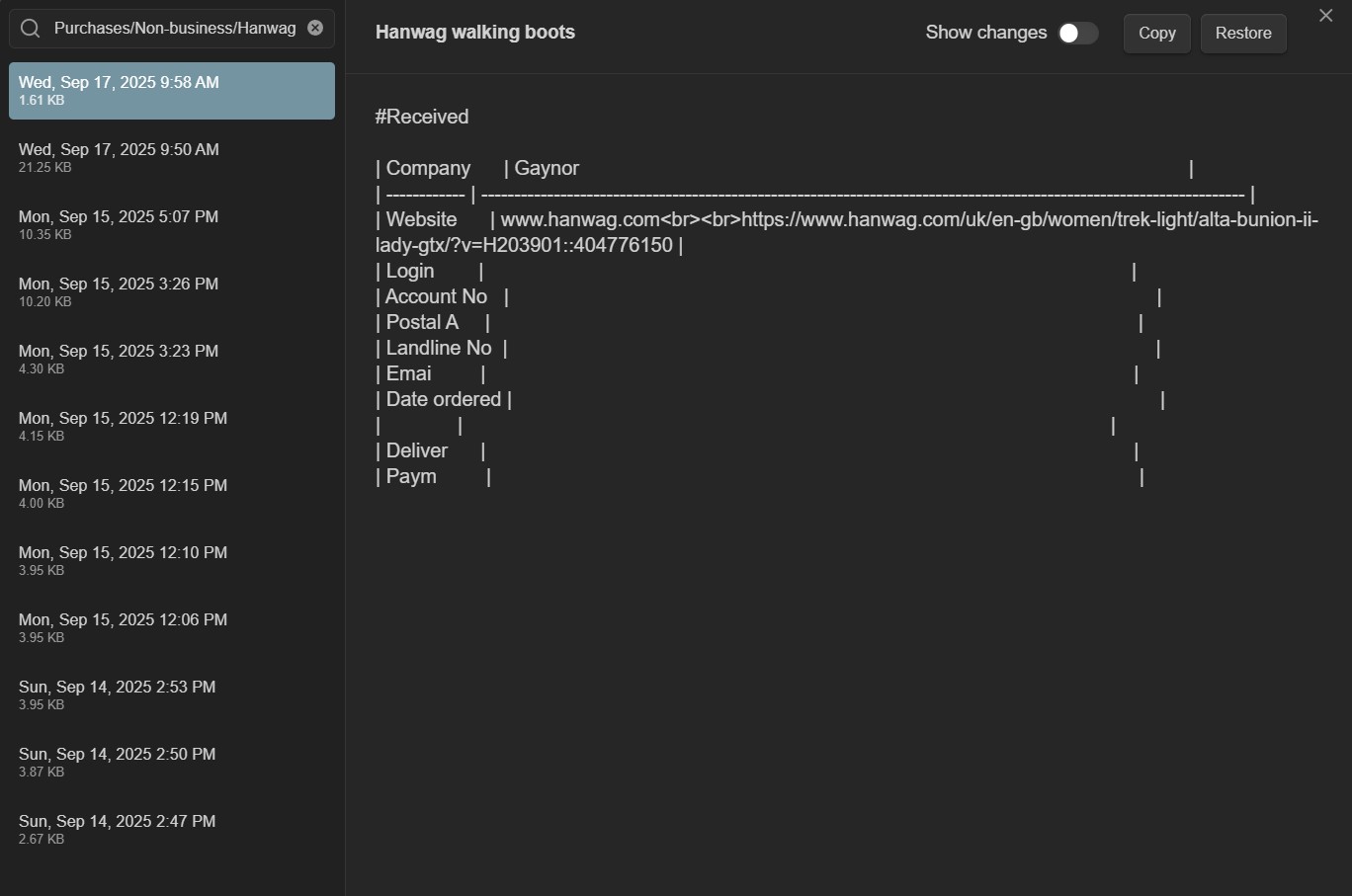 I went to the File recovery core plugin and selected snapshots, searched for the file in question and selected what looked like the correct version to restore. However, it restored a much earlier version (one that I’d only just started creating nearly a year ago).