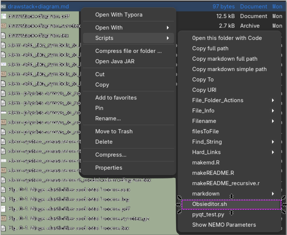 I copy this script to $HOME/.local/share/nemo/scripts. You could do the same in Nautilus. Then, I just select the markdown note that I want to edit in Obsidian from the context menu, and I get the note and its attached files all in an Obsidian vault. I created a dummy vault for this purpose - I called it “default”, although you can bring off-vault notes to the vault of your preference. You set that in vault_where_files_must_be_opened variable at the top.