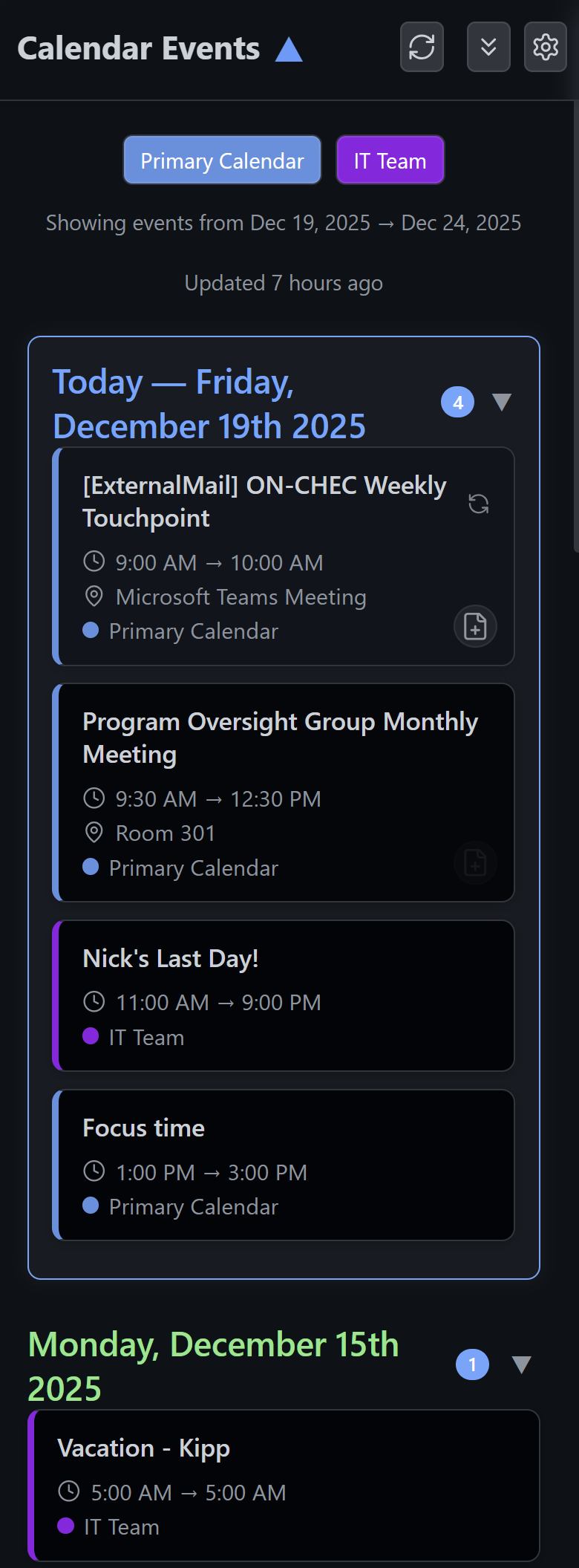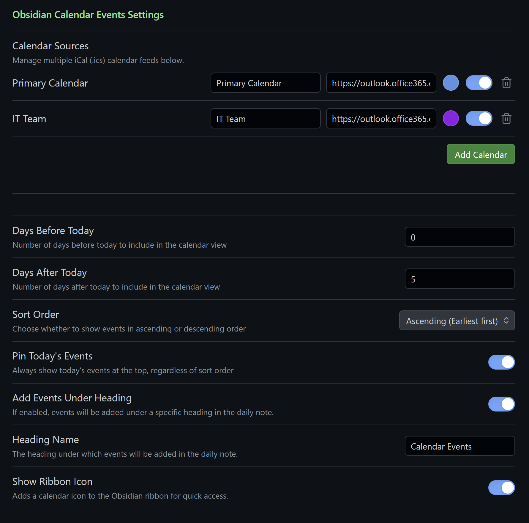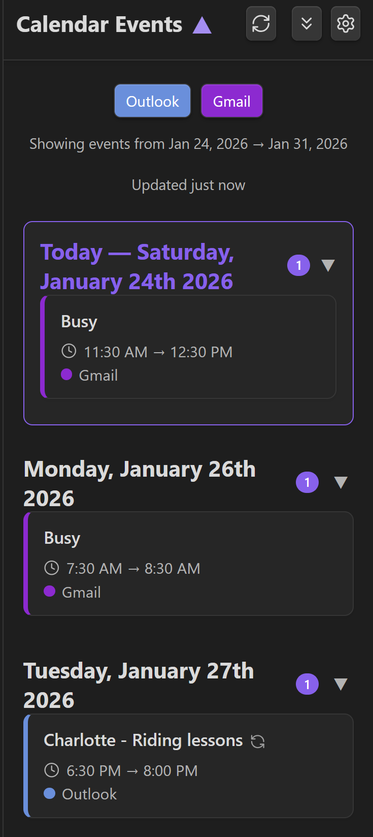 To improve my current workflow, I built an Obsidian plugin called “Obsidian Calendar Events” which mimics the appearance of an Outlook calendar panel.