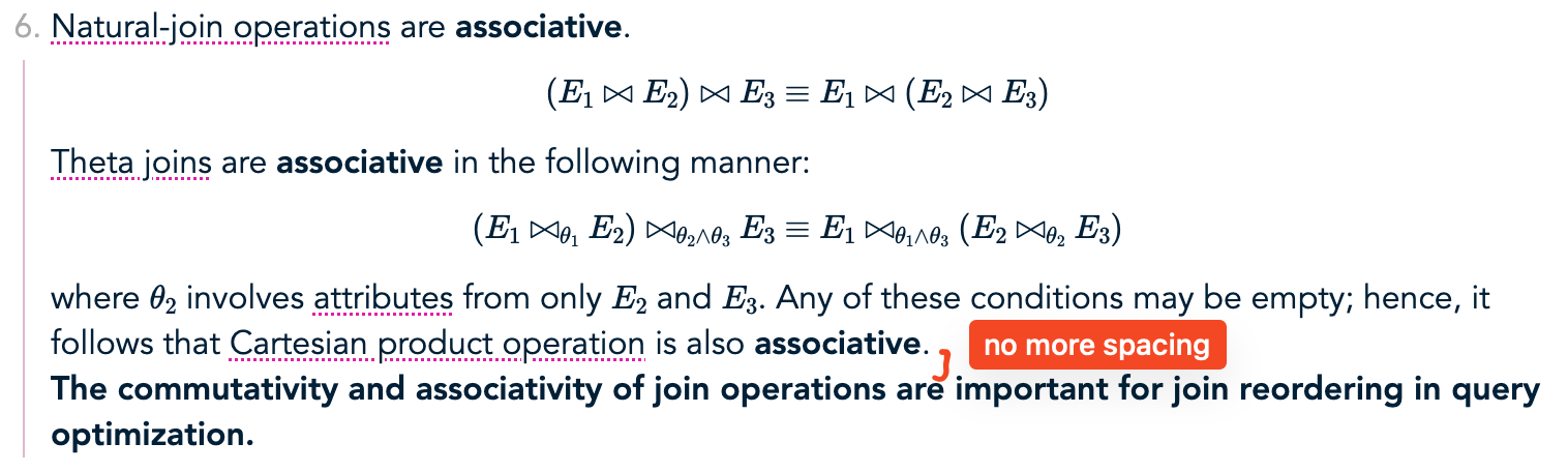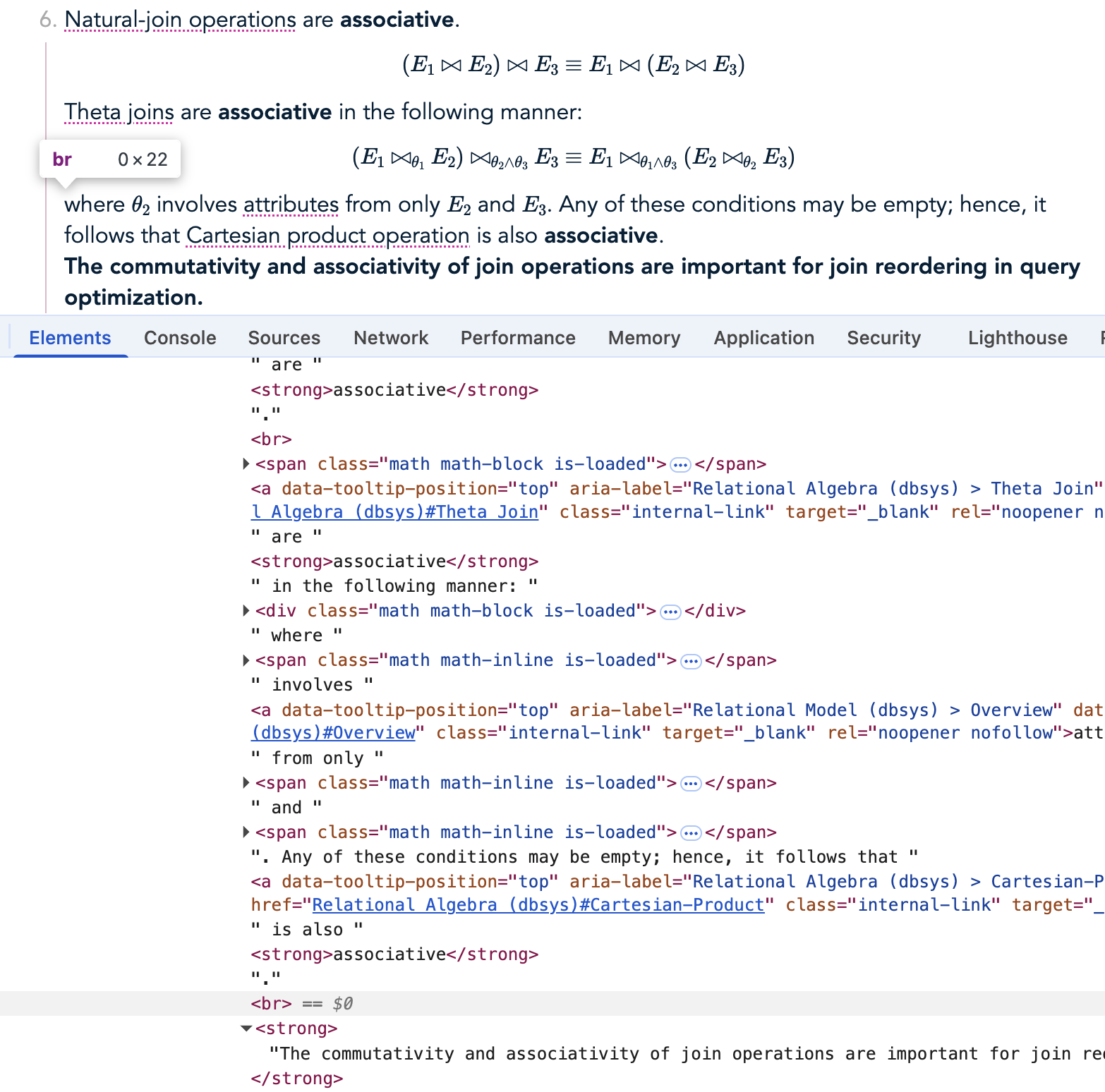 (Your note portion shows “is also associative” + line break + “The communicative” along with their styling. Whereas your DOM portion shows some other area that has “are associative.” + line break + a math block that immediately follows in the next span.)