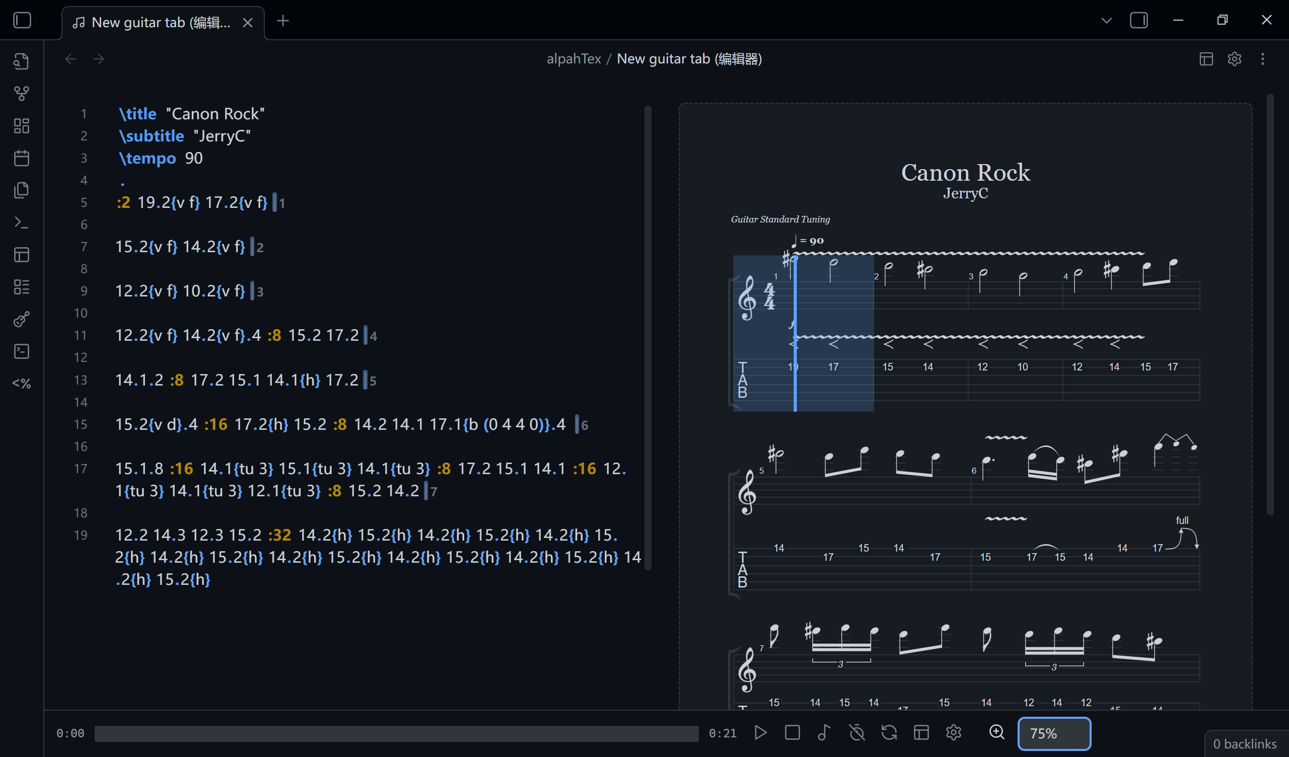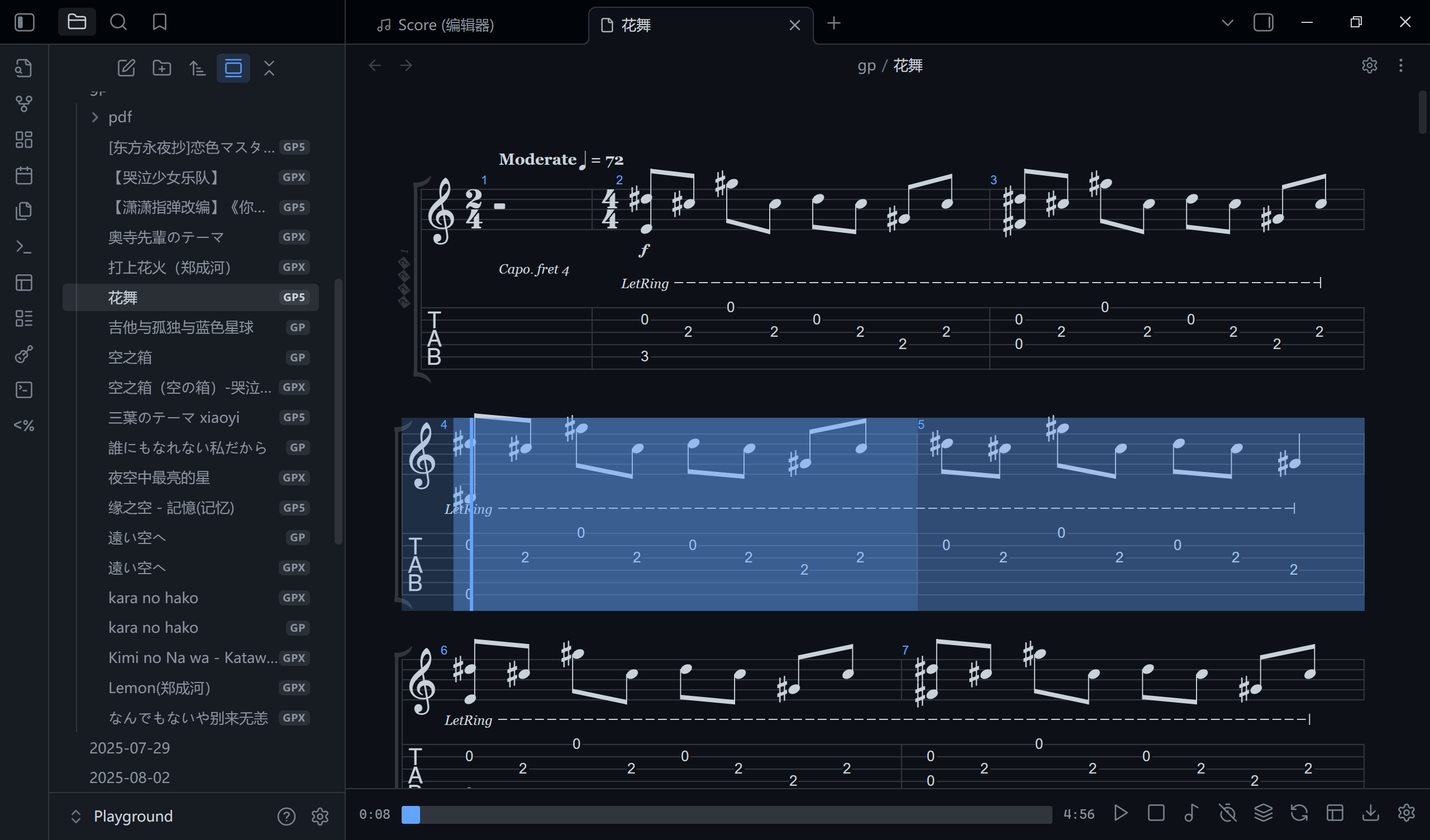 I am working on a new language to write guitar tabs. Instead of ASCII art, it uses a fret.string.duration syntax to render beautiful, playable sheet music directly in your notes. It can also open gp, gpx, gp7, etc.