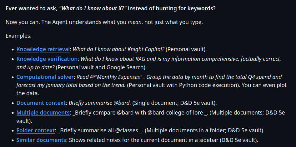 I opened to my own vault, and it seems to work pretty well, answering a question where it definitely had to do some sort of embedding work: I didn’t give it exact word matches, only semantically asked about something in my repo, and it found it.