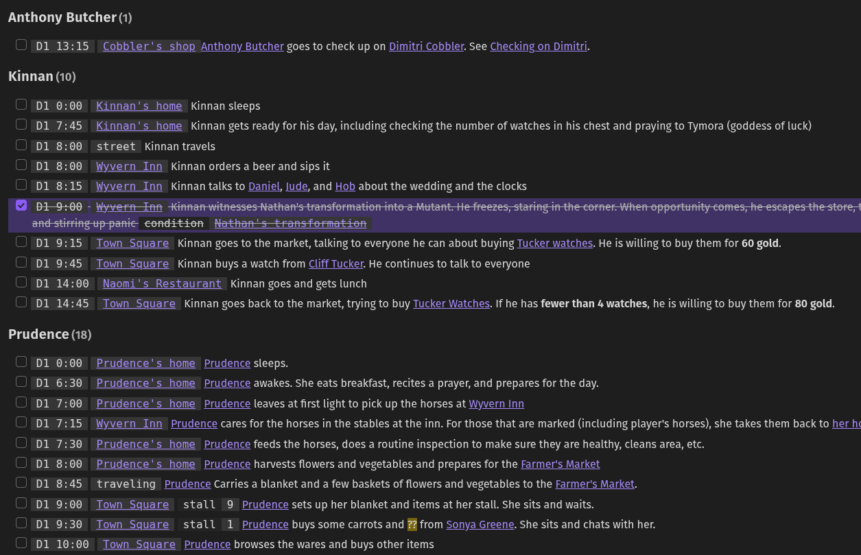 My base contains a series of notes on characters for some writing I’m doing. Those notes each contain their schedule for the various days, organized as a series of tasks. Each task has a time and location associated with it. My goal right now is to get the latest event for each character, before a certain time.