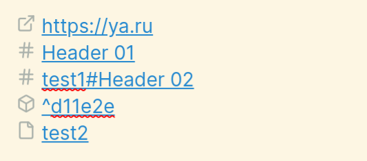 Although I like the idea of Short links plugin (by scottwillmoore) to put icon near the link, so you can unambiguously see, what kind of link this one is (to note, to note’s header, to block, to Internet).