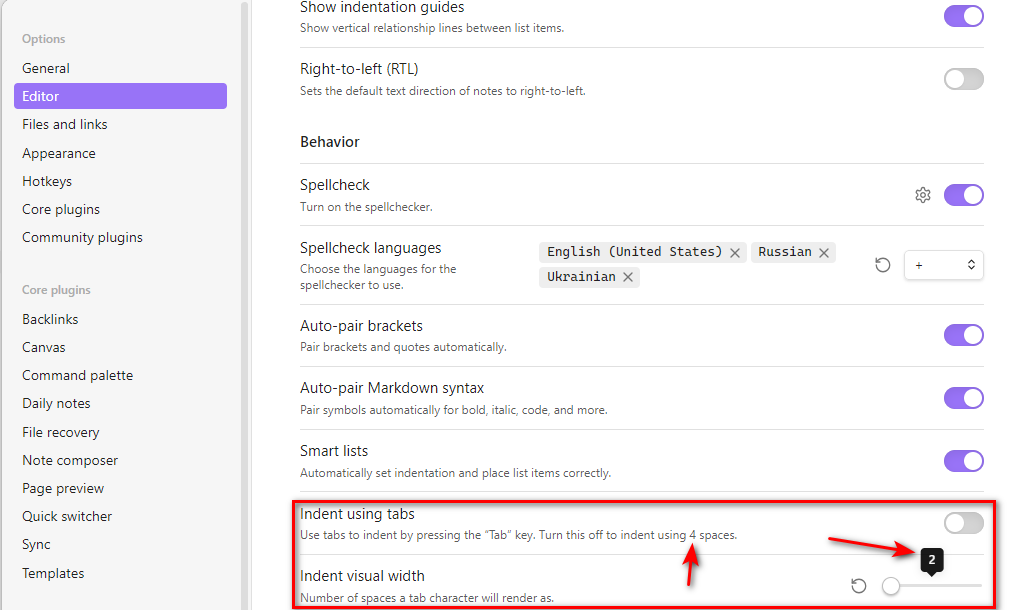 But Obsidian partially ignores this setting and always inserts 4 spaces when you press Tab button in the editor, if you have setting Indent using tabs disabled.
