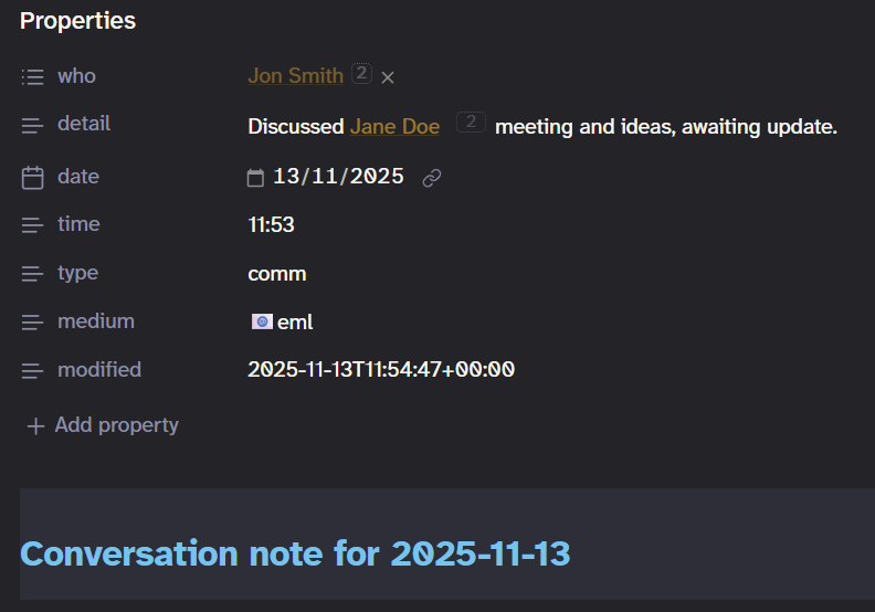 I have moved from inline metadata based conversation tracking (in daily note) to file based so I can use Bases and the plugin allows me to have links to E.G. the file of the person with whom I’ve communicated. However, if I add other MD links in the ‘details’ field, along with text, the spaces do not seem to be rendering. Screenshots below
