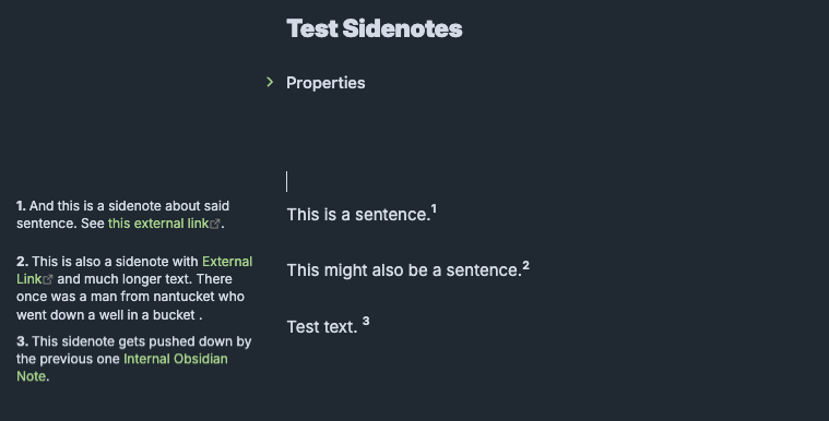 This is a plugin I’ve prototyped in order to solve a problem. I’ve seen multiple strategies for incorporating sidenotes and margin notes. I had cobbled together a CSS snipper that worked pretty well but CSS alone had limitations. The links in the sidenotes were not clickable. I couldn’t quite get incrementing numbers to work. So I put together this plugin to try to solve my problem.