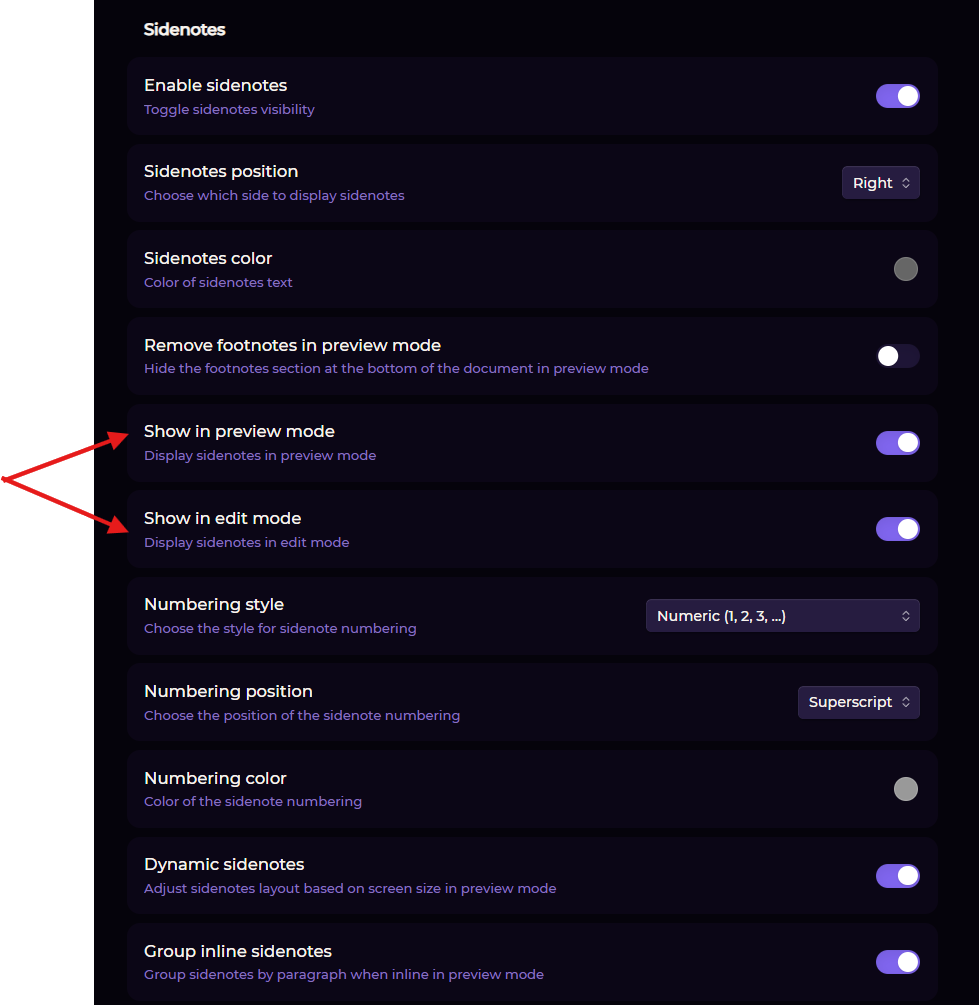 I also added an option to anchor the sidenotes to the edge of the editor, as well as the original style of anchoring them to the note’s text.