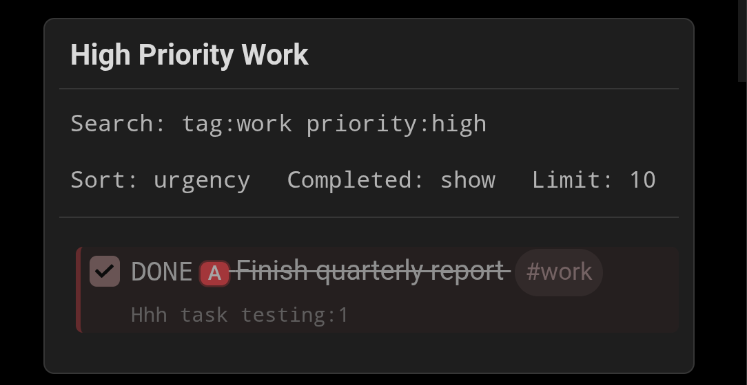 With v0.10.0 just released, I feel really proud of what this plugin has become, much more than what I initially envisaged for simple task capture and review tool. The initial community feedback has helped shape some powerful features with the advanced search, embedding tasks list queries in pages, and other usability and consistency tweaks.
