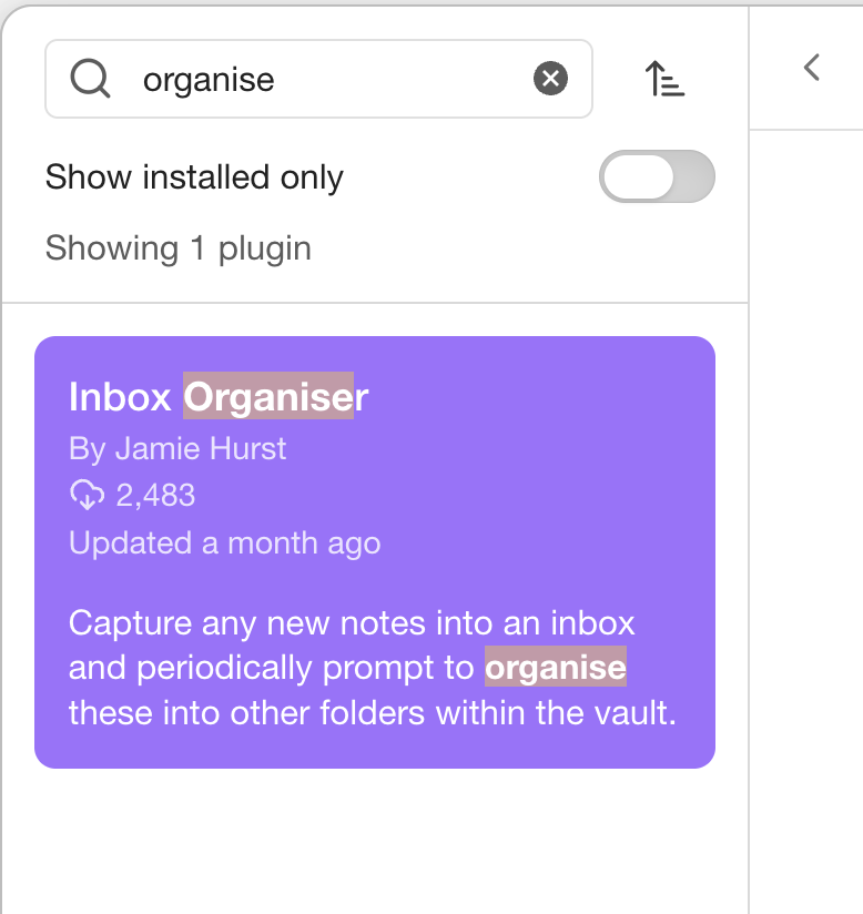 In my case when searching for plugins to organise my vault I found only a single plugin returned: