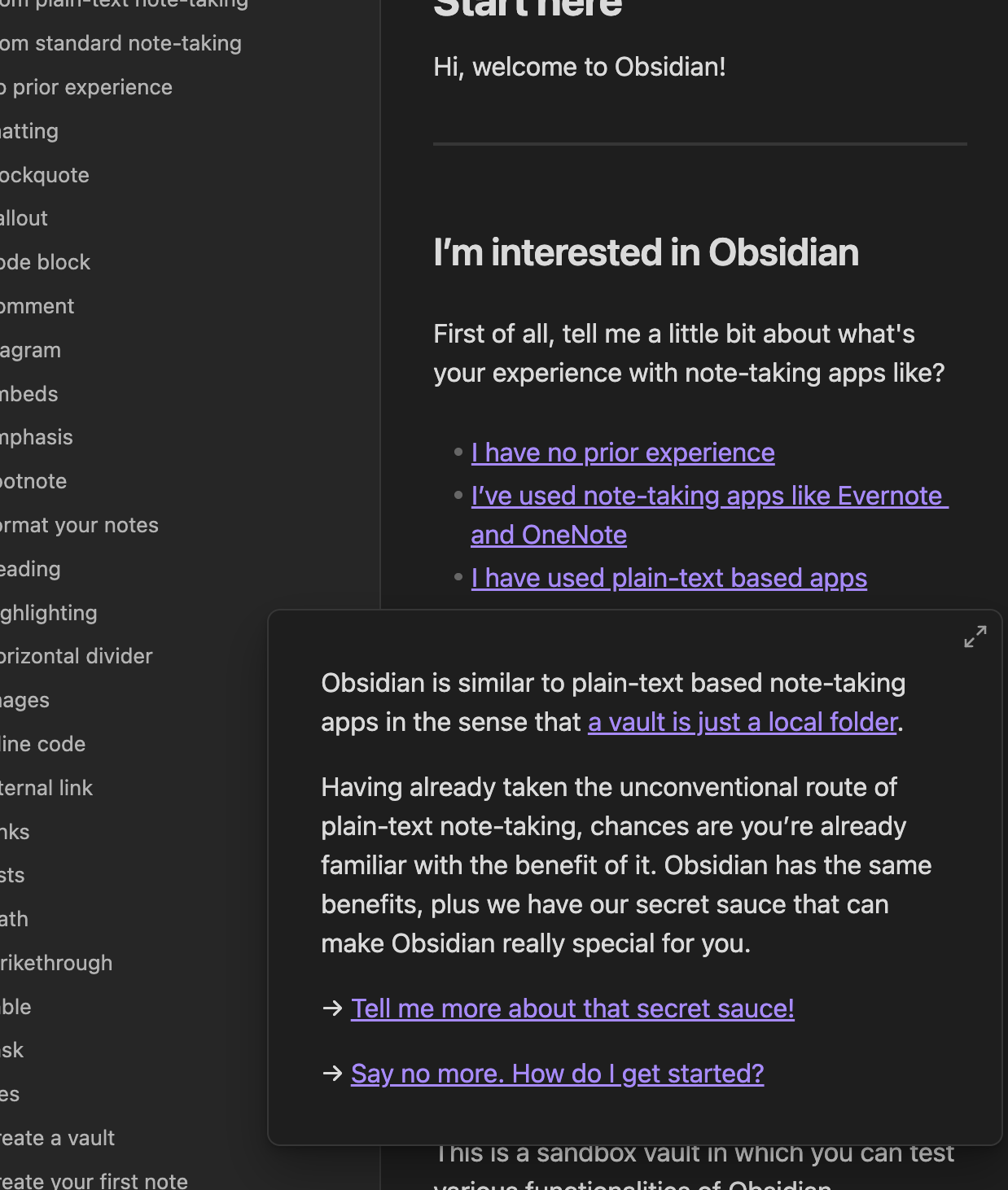 Have you tried hovering internal links in sandbox vault? For example in the screenshot I hovered [[From plain-text note-taking|I have used plain-text based apps]].