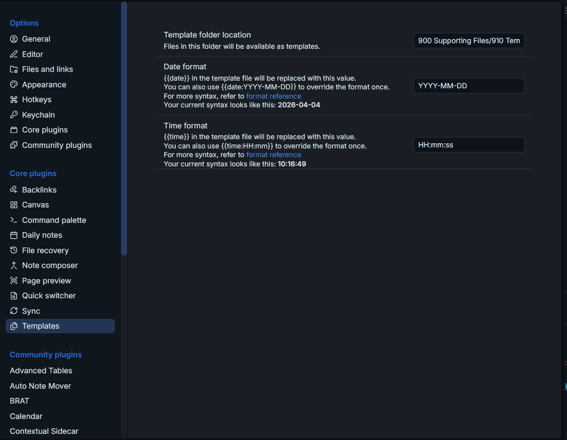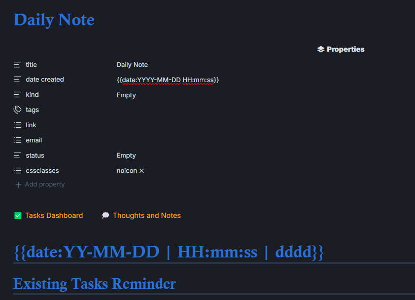 So in my Daily Note template for instance I have {{date:YYYY-MM-DD HH:mm:ss}}(see below)