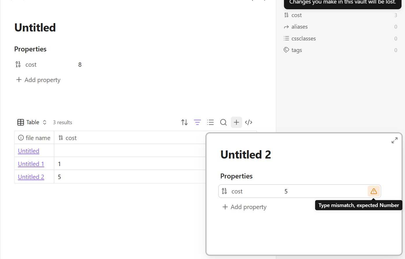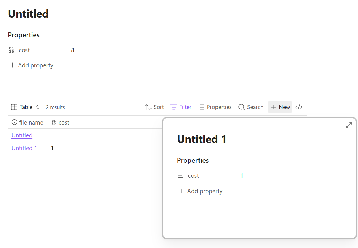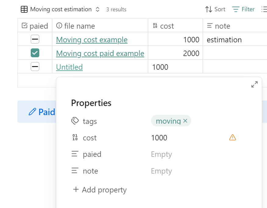 I made a base with the filter if tag is move and property cost (number) is not empty. If I add a new note from there and fill the cost field with a number I still get the exclamation point with the hover message “type mismatch expected Number”. The number is on the left side and does not count in the summ.