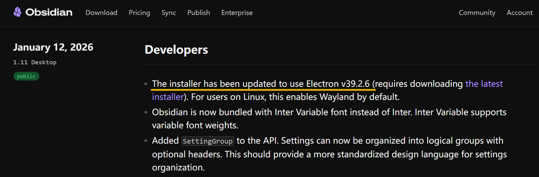 This means Obsidian 1.11’s installer has been updated to the corresponding Electron version.