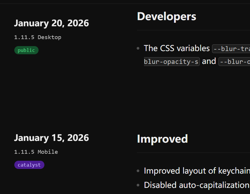 When viewing the changelog, you’ll see two tags: public and catalyst: