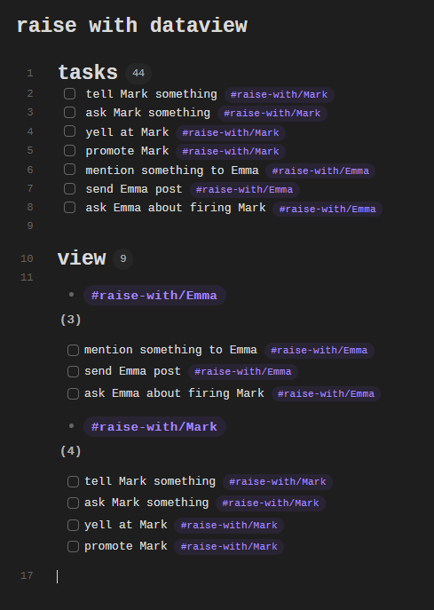 I then build a dataview that filters only for files with #raise-with tags, then group the tasks by the specific tag.