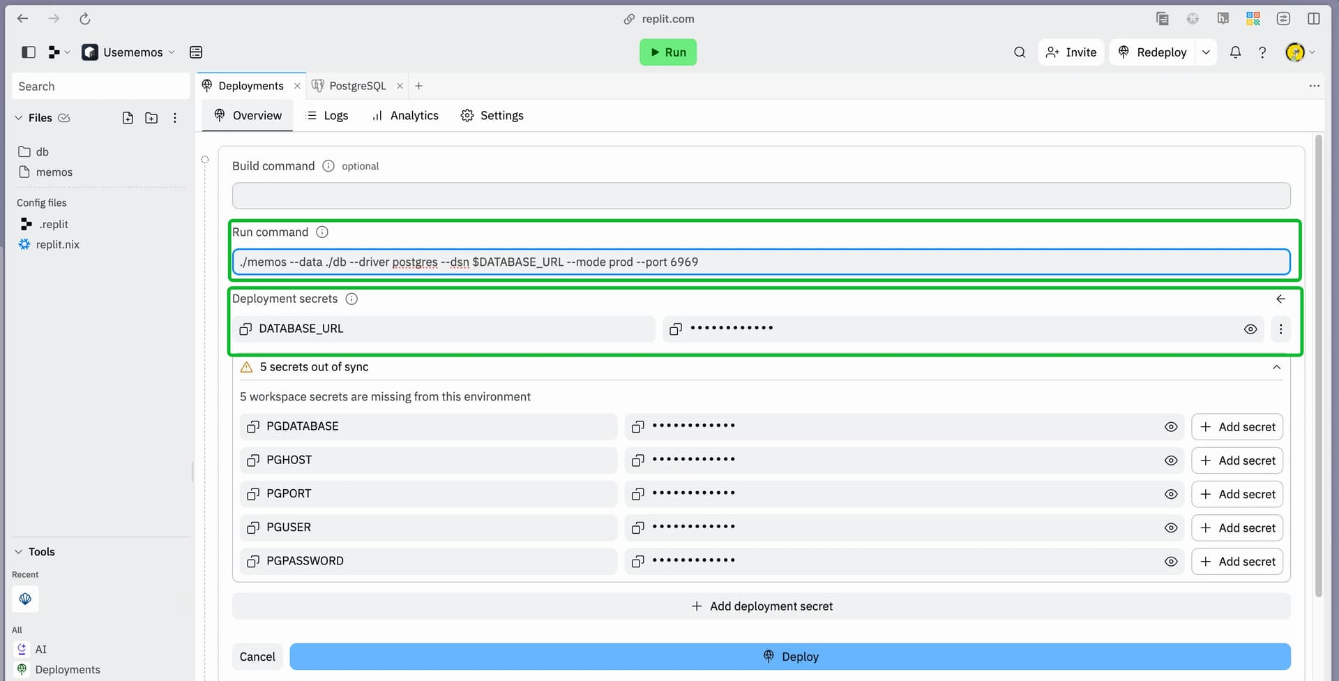 To deploy as Autoscale Deployments, remember to click Add DATABASE_URL as the environment variable, fill in the Execute command, and then click Deploy!