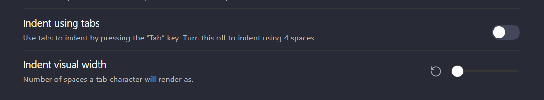 A huge part of the benefit of Obsidian is that the underlying files are in a standard format that many tools can work with, and having settings like being able to configure how indentation is handled is key for Obsidian to be able to work with other tools effectively.