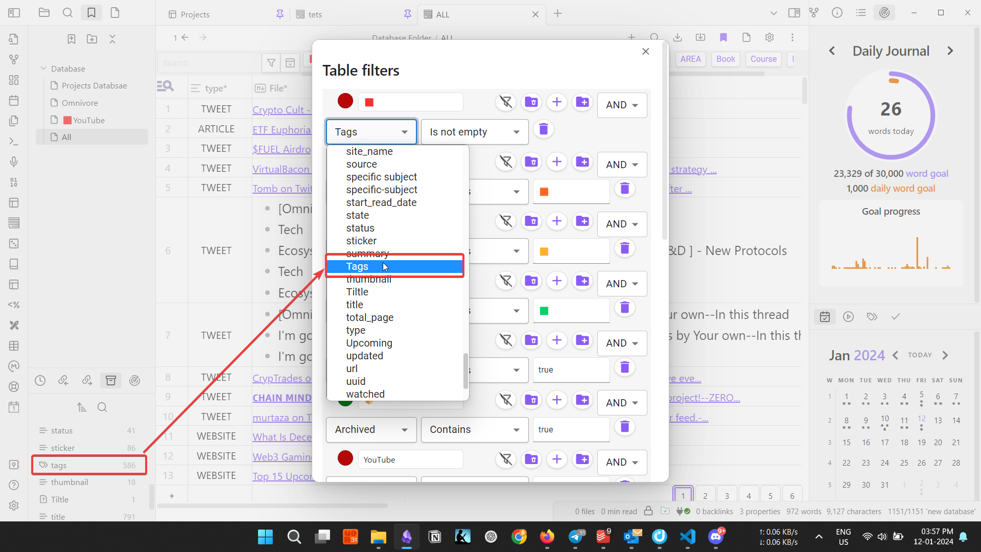 i have property called “tags” in my vault but when i used filter option in Database folder plugin it show in capital letter “Tags” . SO the filter can not be applied. Can someone help me please